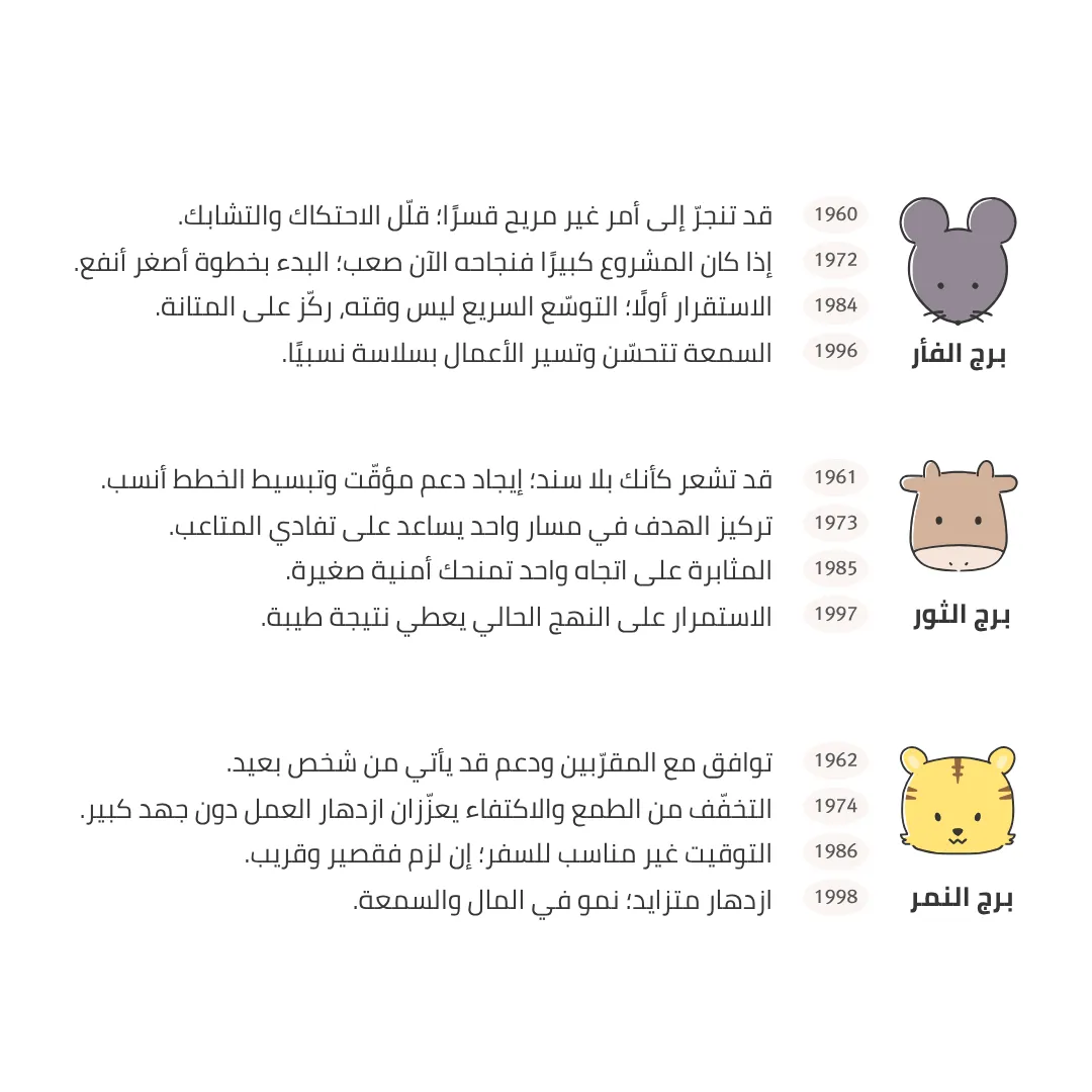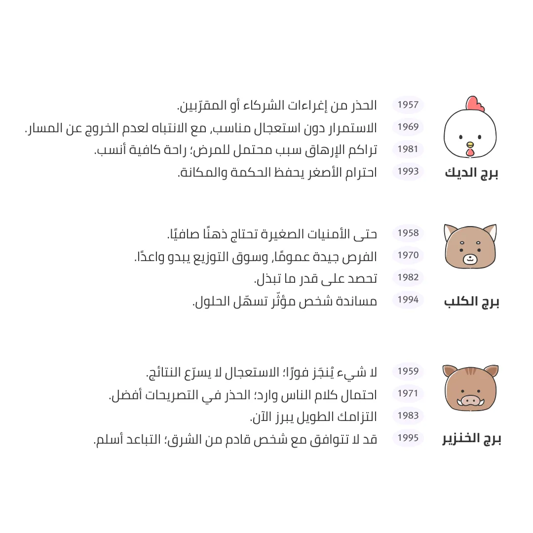 لمعرفة المزيد عن الأبراج الصينية وخصائص كل برج، اقرأ دليل الأبراج الصينية الاثني عشر الشامل.