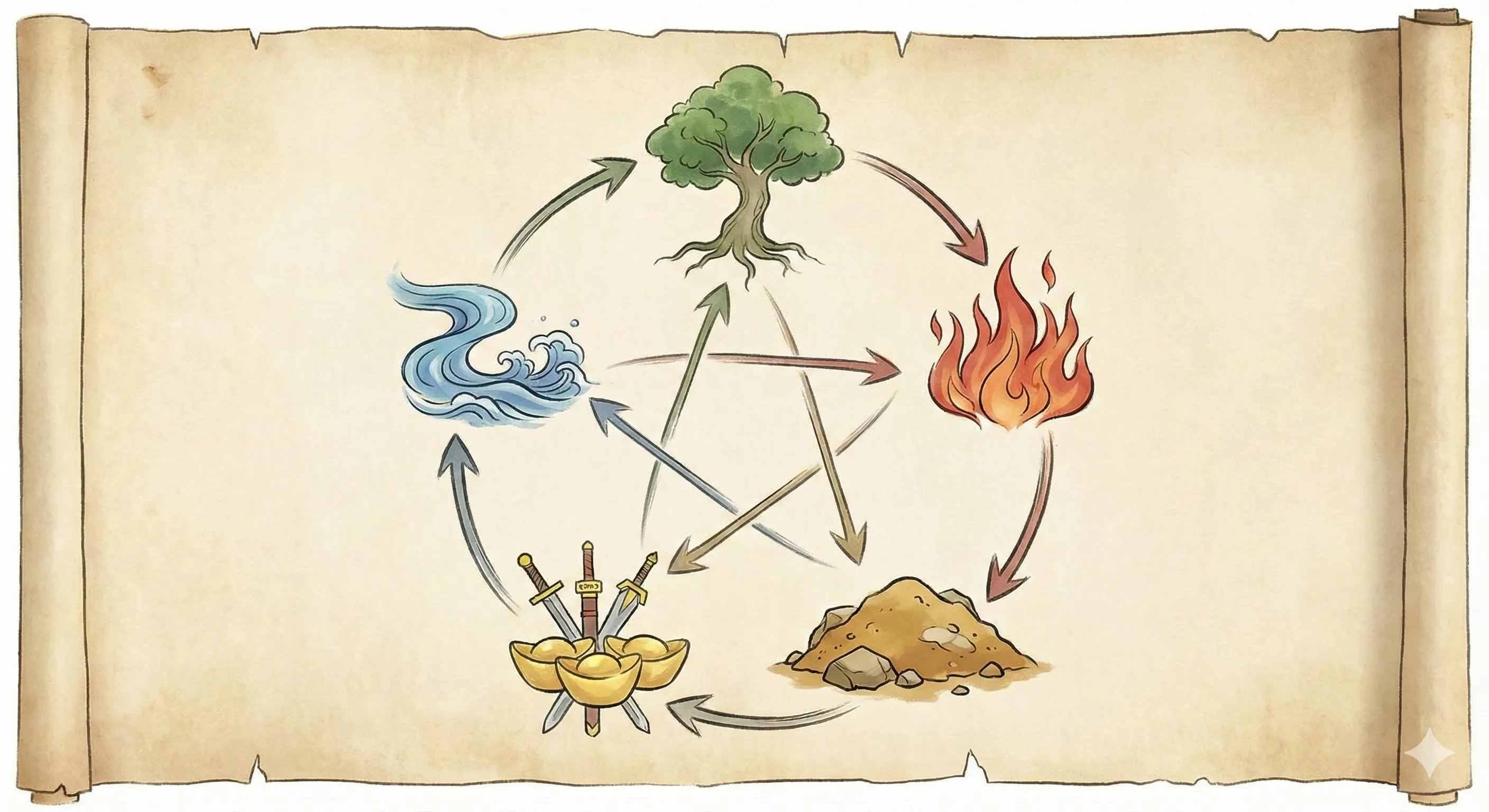 بمعنى آخر، الخشب (木)، والنار (火)، والتراب (土)، والمعدن (金)، والماء (水) لا تشير مباشرة إلى هذه المواد، بل إلى الخصائص وأنماط التغيير التي تمثلها.