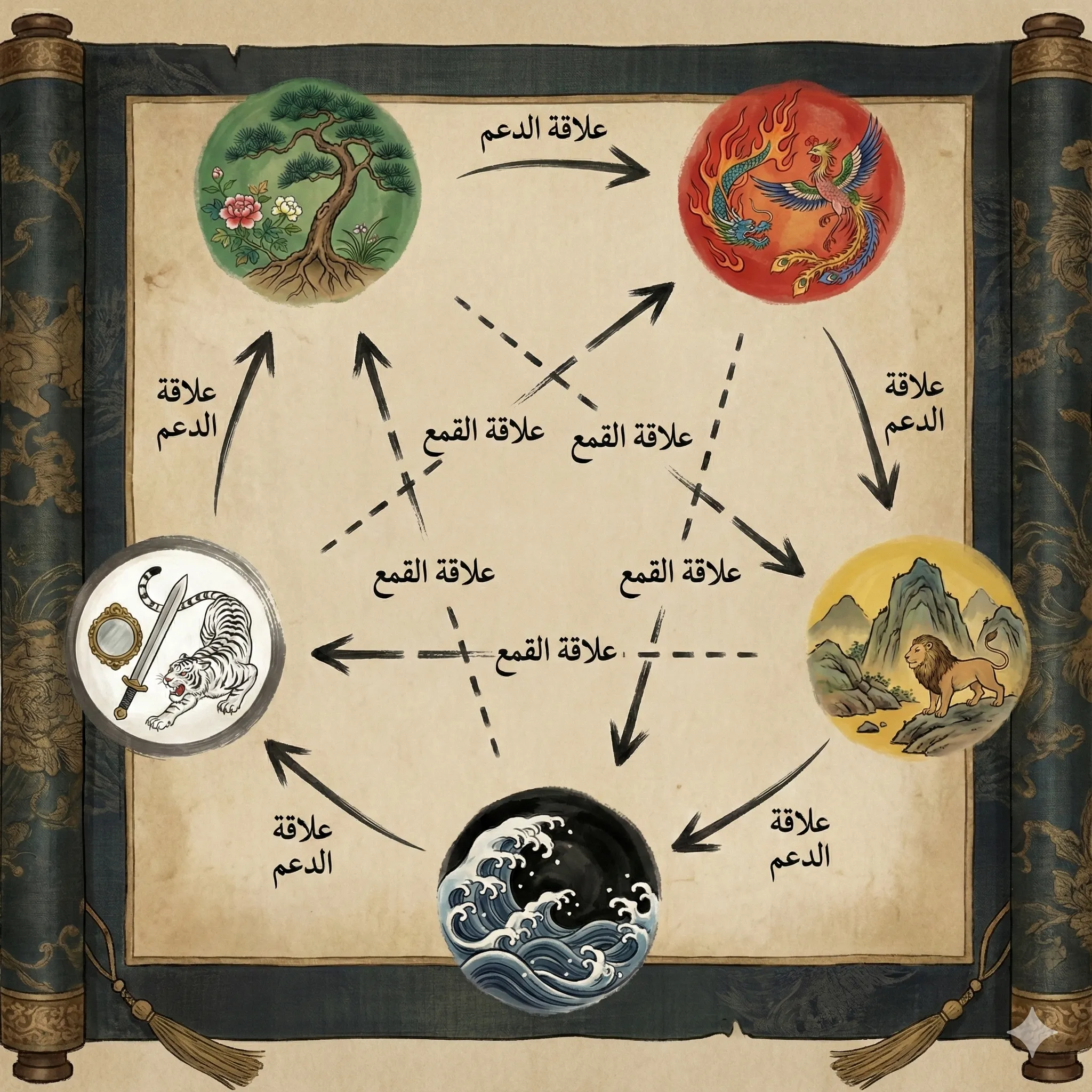 الماء ← الخشب: الماء يُغذي الخشب ← العاطفة والمرونة (الماء) تدعم النمو والتحدي (الخشب)