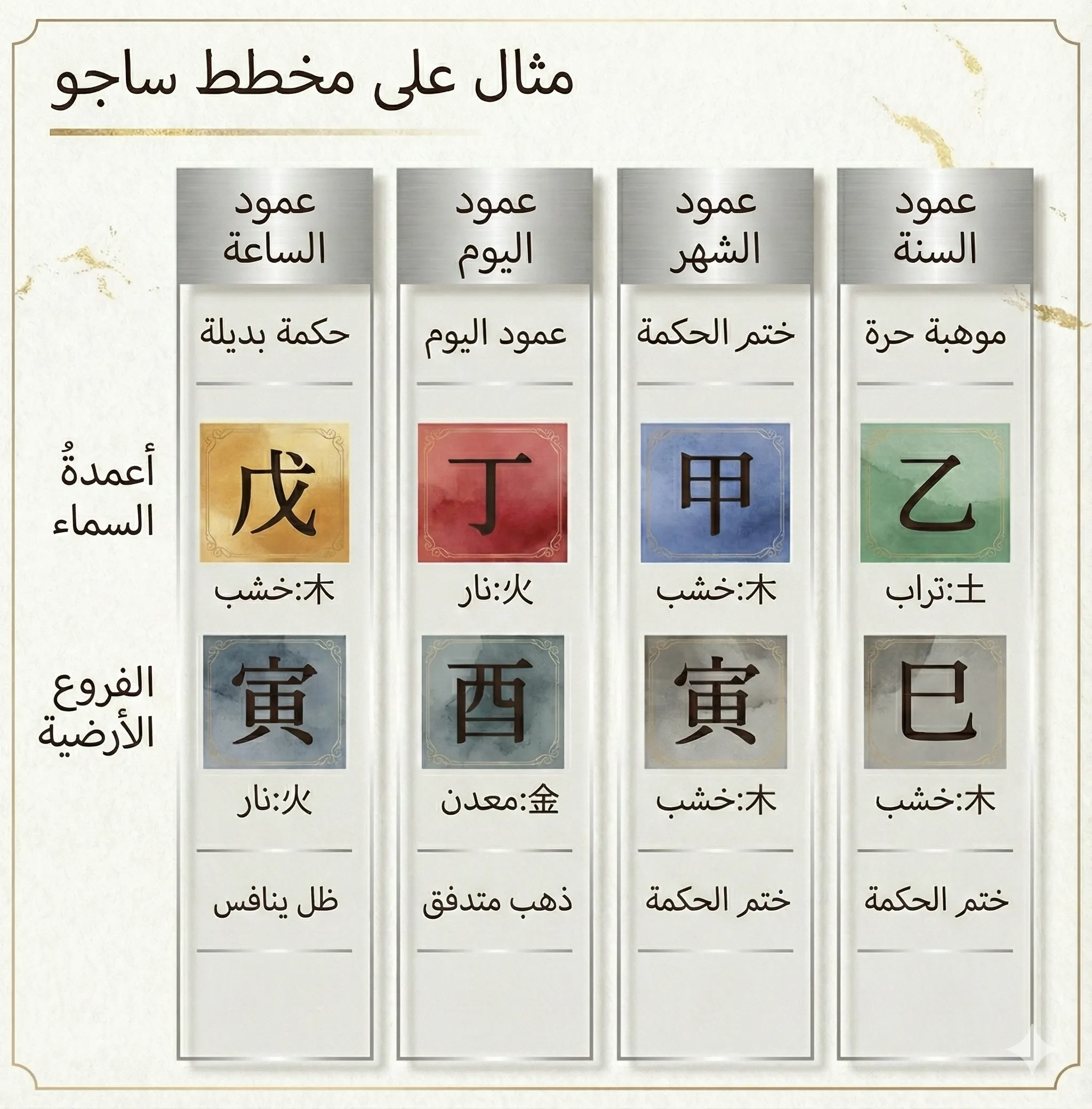 تُحوّل كل هذه الأحرف إلى العناصر الخمسة: الخشب (木)، النار (火)، التراب (土)، المعدن (金)، الماء (水)، وحسب التركيبة والنسبة، يتم تحديد "البروفايل الطاقي" للشخص - هل هو "كثير النار، قوي الماء، أو ثقيل التراب؟"