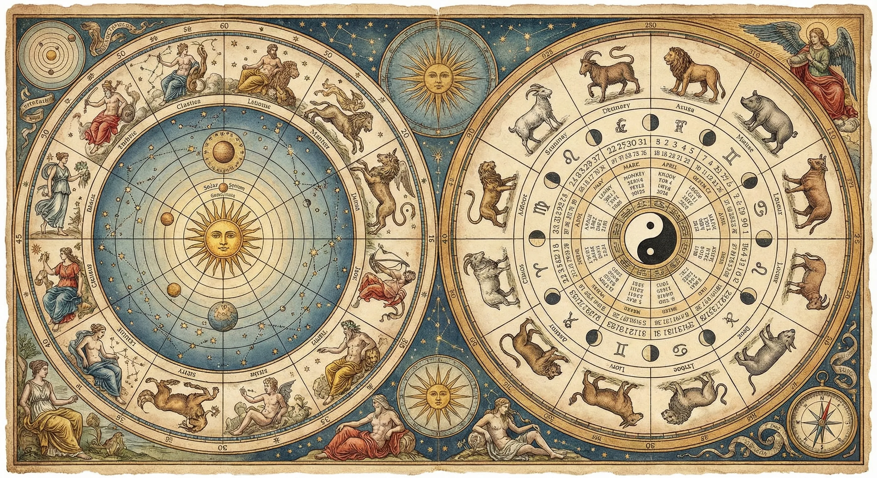 - الشرق: حيوان السنة هو المدخل، والتفسير الفعلي هو بنية تنظر إلى السنة والشهر واليوم والساعة كاملة مع العناصر الخمسة معاً