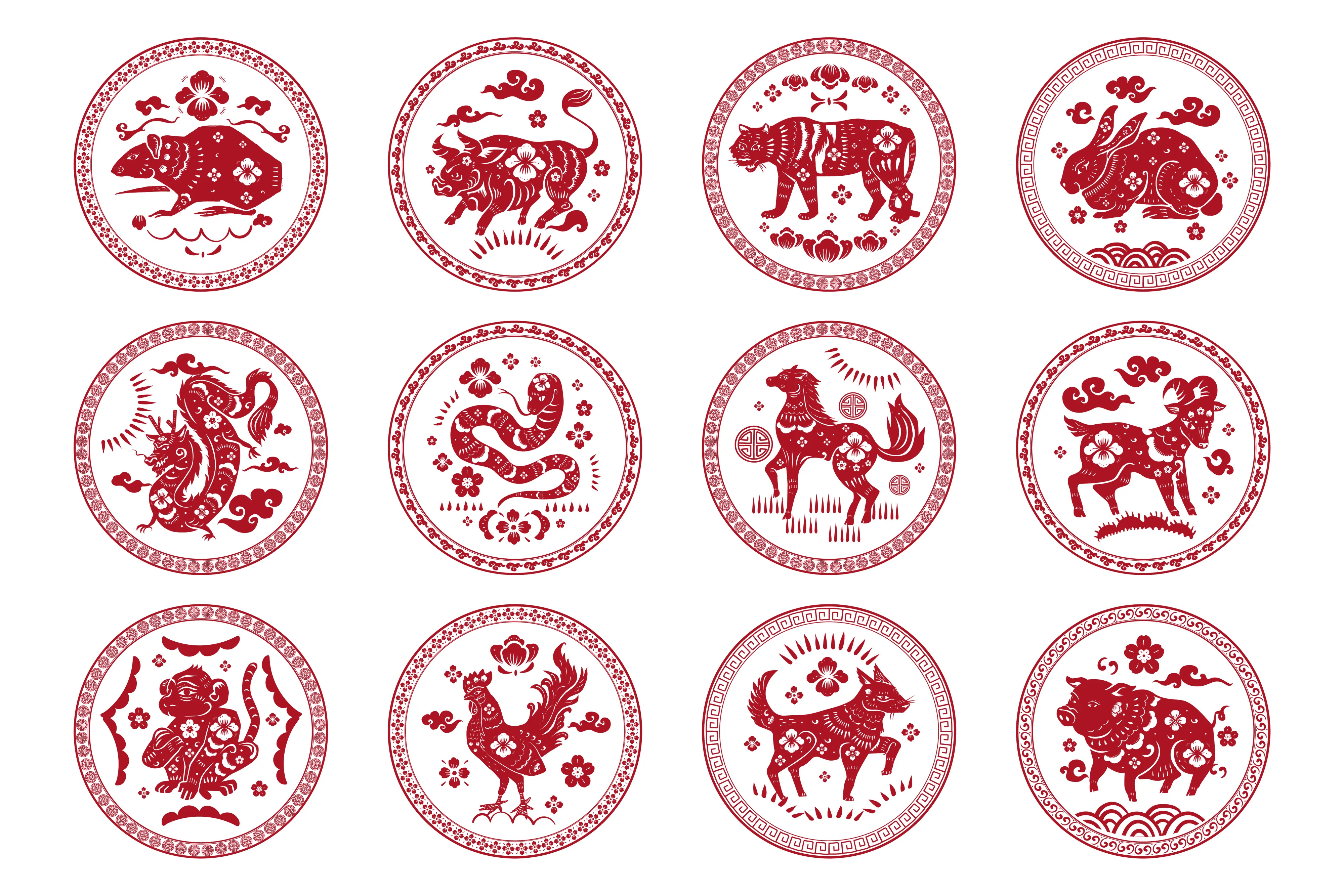 - مثل الفأر والثور والنمر والأرنب والتنين والثعبان والحصان والماعز والقرد والديك والكلب والخنزير، تُستخدم الحيوانات التي يمكن رؤيتها بسهولة في الحياة اليومية أو التي لها رمزية قوية